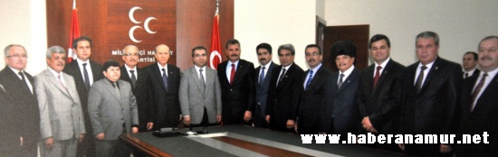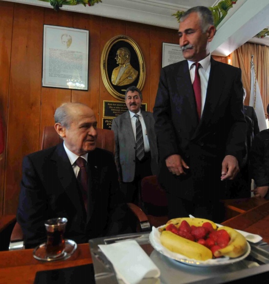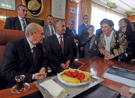 MHP Lideri Bahçeli, Genel Merkez?deki odasında Mersinli MHP?li belediye başkanları ile yaklaşık 2 saat süren görüşme yaptı. Ziyaretin gündeminde ise yaklaşan 2014 seçimlerinde Mersin’de yeniden birinci parti olma ve mevcut MHP’li Belediyelerin korunarak diğer partilerde olan belediyelerin kazanılması vardı.