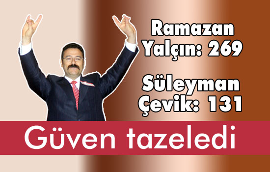 Yoğun katılımla gerçekleşen MHP İlçe Kongresi?nde 269 oy alan Ramazan Yalçın, 131 oy alan Süleyman Çevik?i geride bırakarak güven tazeledi.